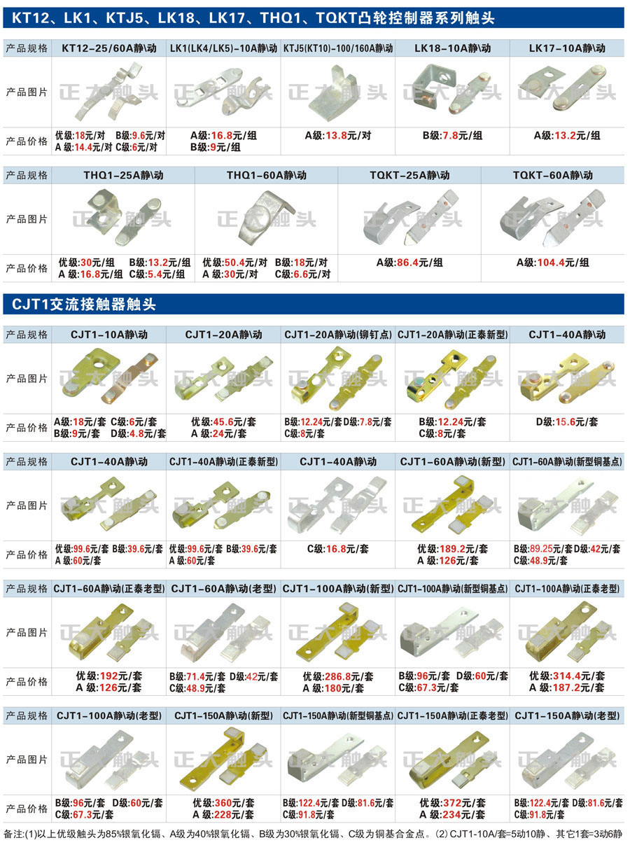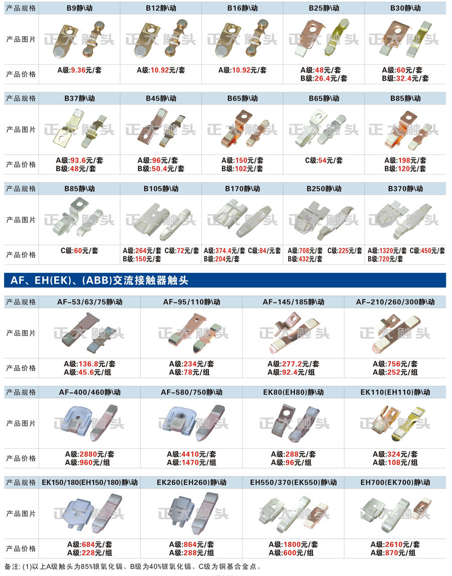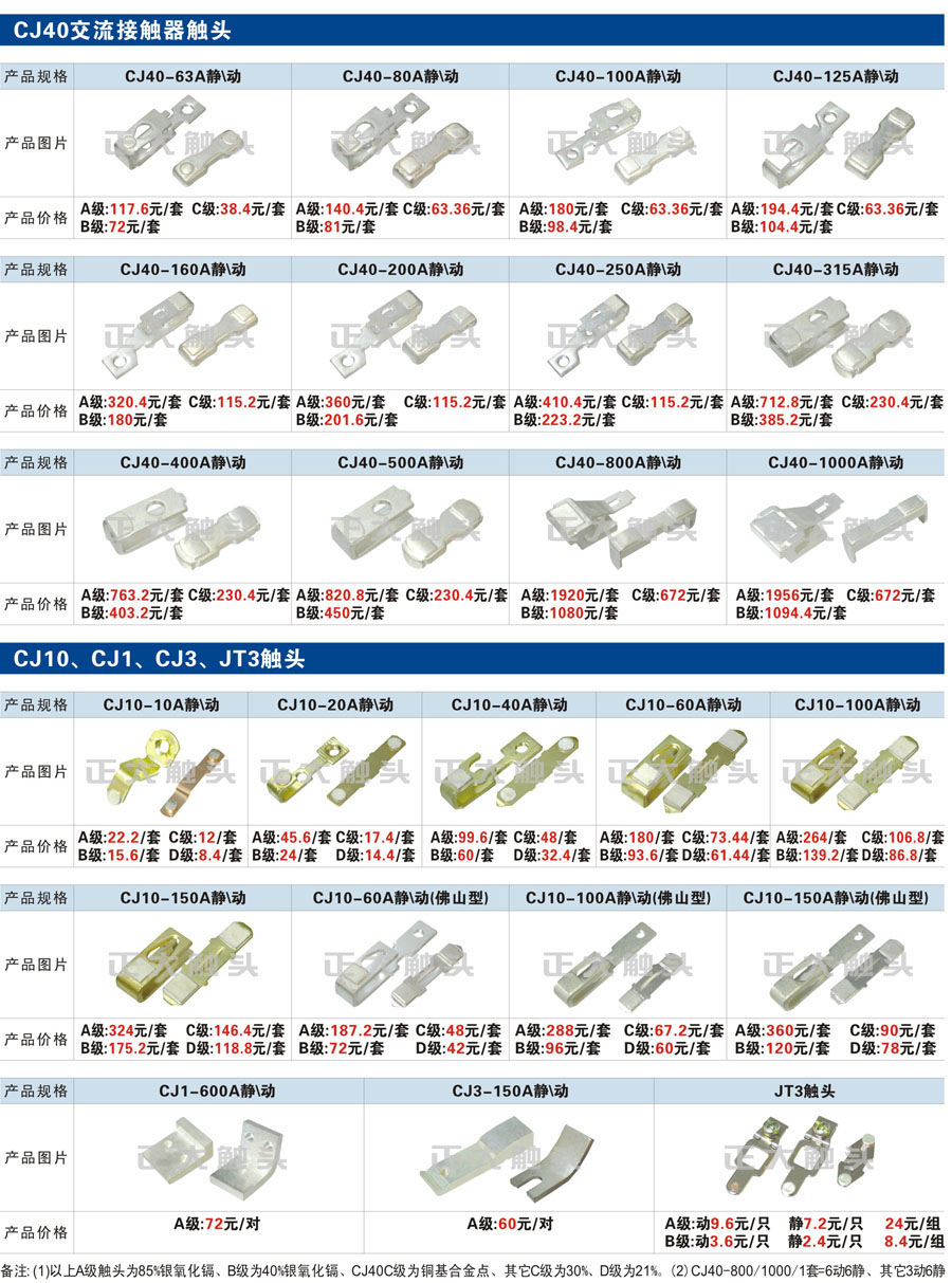 触头元件作为电器开关核心元件,主要用于接触器,继电器,断路器,凸轮控制器,补偿器,行程开关,脚踏开关,辅助开关等。开云体育电气现生产CJT1,CJX1,CJX2,CJX4,CJX5,CJX8(B系列)CJ20,CJ40,CJ12,CJ15,CJ24,CJ24Y,CJ0,CDC10,CJ91,CT91,CJ913,CJ914,CJ3,CJ8Z交流接触器触头,CZ0,CZ1,CZ3,CZ17,CZ18,CG5直流接触器触头,QJ3,QC83补偿器触头,凸轮控制器,主令触头,KT10,KT12,KT14,KTJ1,KTJ5,KTJ6,KTJ15(QT5),LK1,LK17,LK18,THQ1,TQKT等;断路器触头DW10,DW16,DW15,DW17,DW45,DZ10,DZ20,内燃机触头,矿用触头,叉车,吊车触头,JYN1,JYN2,ZN28,SN10,VS1,梅花触头等。进口ABB系列AF,EH,EK,富士SC系列,日立H系列,施耐德LC1系列,西门子3TF,3TB系列,LG公司(LS产电)GMC系列,三菱机电SN系列。与国内正泰,德力西,天正,人民等,国外ABB,施耐德,西门子,富士,三菱等厂家电气配套。